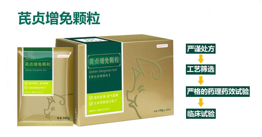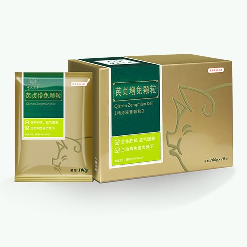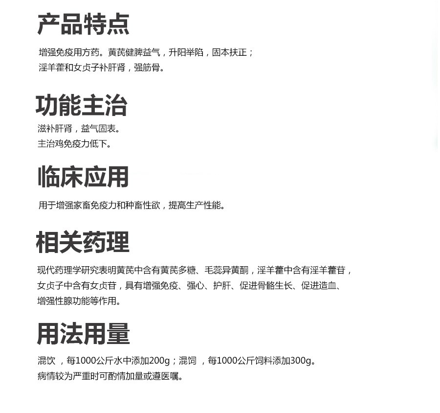 【處方】黃芪、淫羊藿、女貞子。 【性狀】本品為黃棕色的顆粒;味甜。 【功能】滋補肝腎,益氣固表。 【主治】主治免疫力低下。 【用法用量】 混飼,每1000公斤飼料添加300g; 混飲,每1000公斤水中添加200g。 病情較為嚴重時可酌情加量或遵醫(yī)囑。
